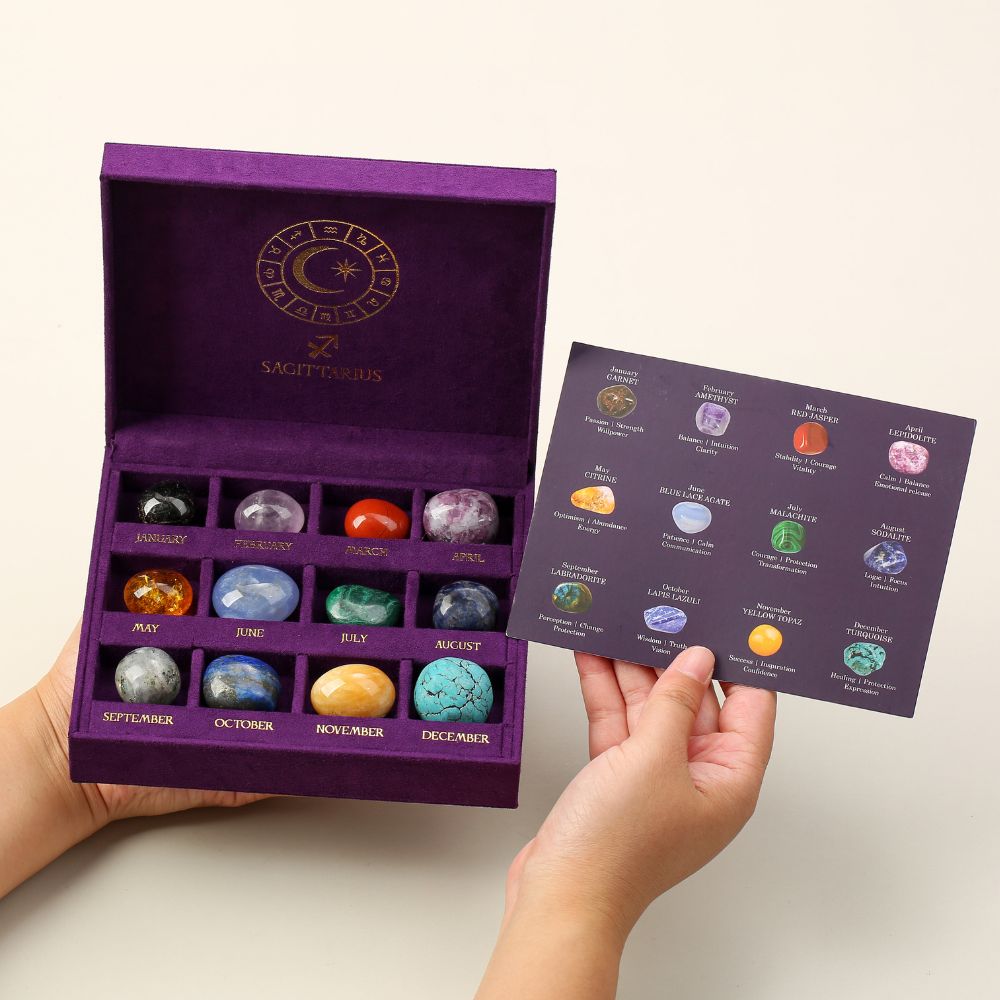 12 authentic crystals, chosen to reflect Sagittarius’ wisdom, optimism, and love for freedom.