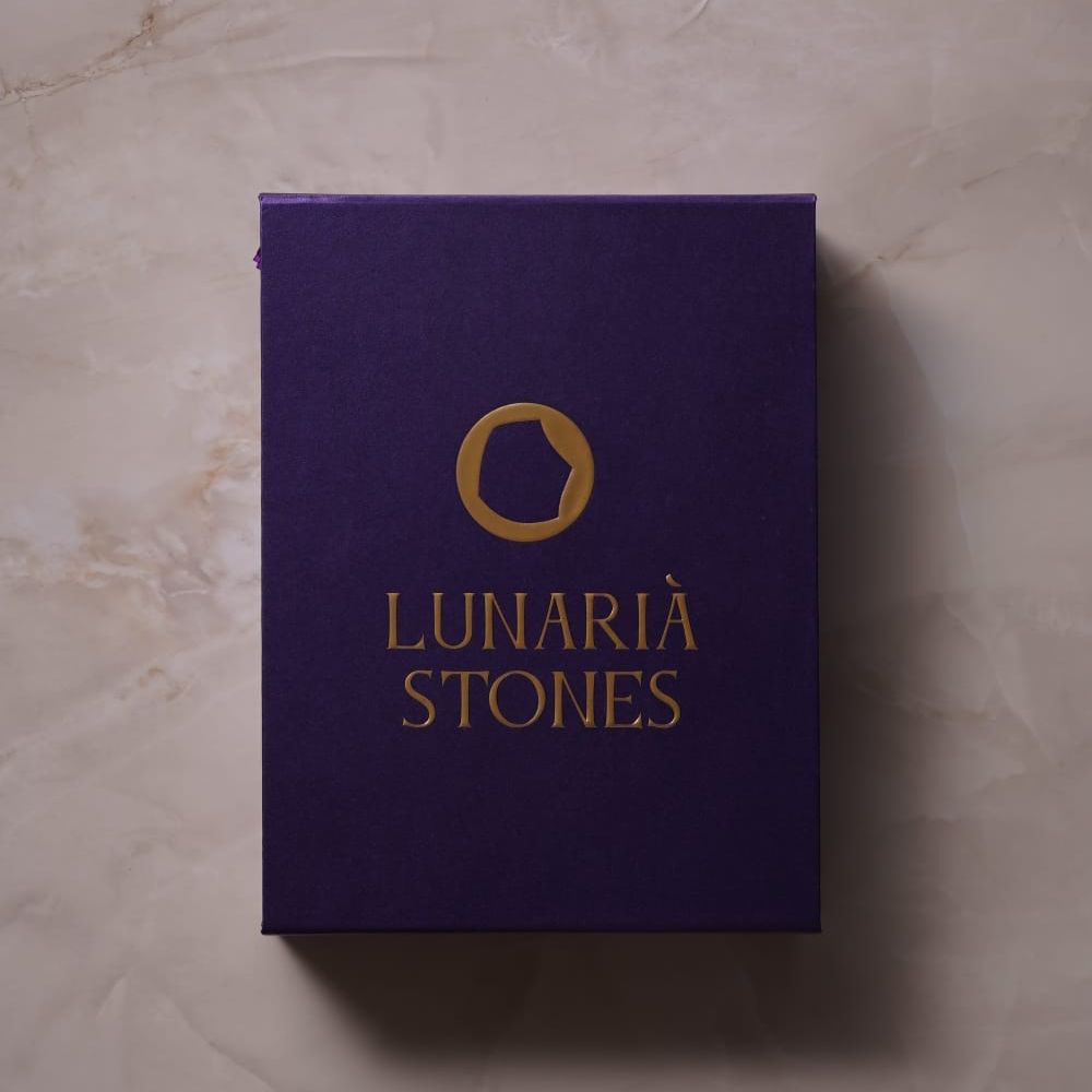 Velvet purple box with golden logo, zodiac guidance card, and satin pouch — a meaningful gift ready to inspire or to keep as your personal talisman.